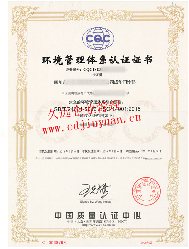 環(huán)境管理體系認證證書