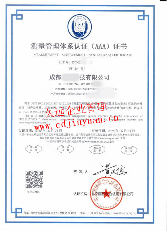 測量管理體系認證證書